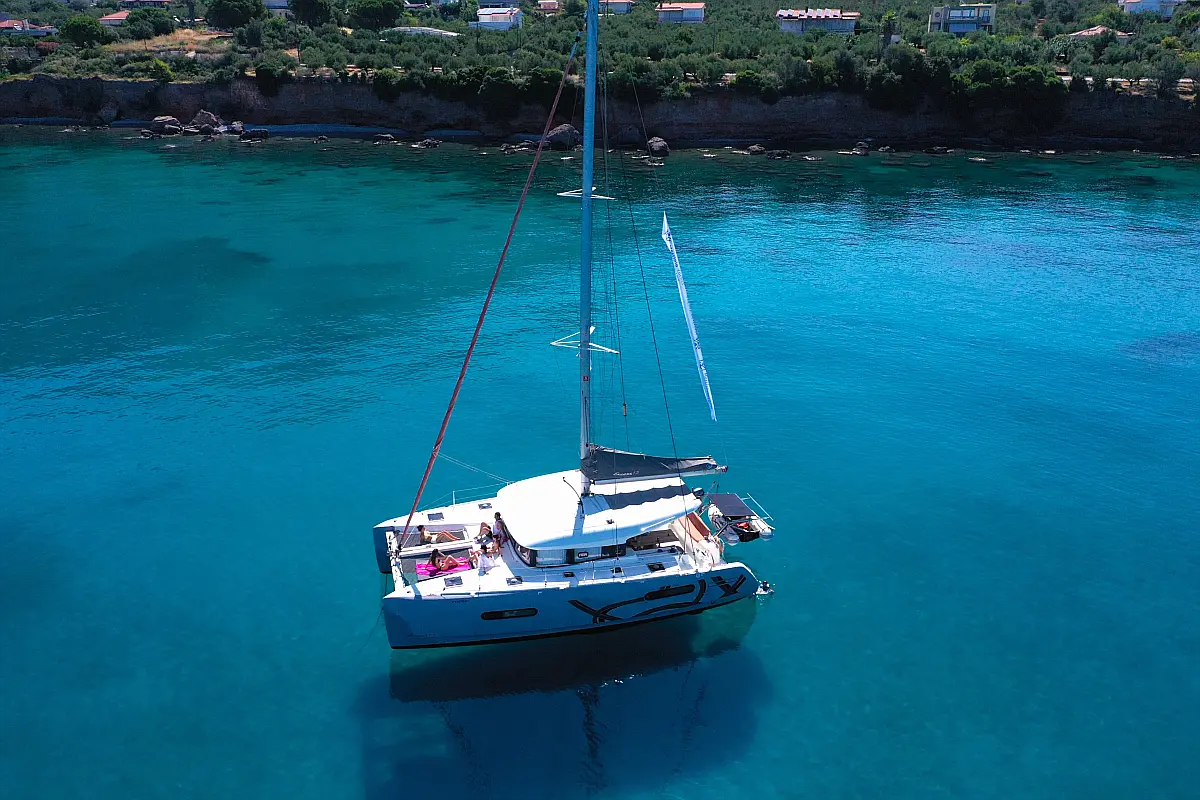 Step aboard the Aelia, a stunning 2021 Fountaine Pajot Isla 40, and discover the breathtaking coastline of the Messinian Gulf. Based in Kalamata, this modern boat is the successor