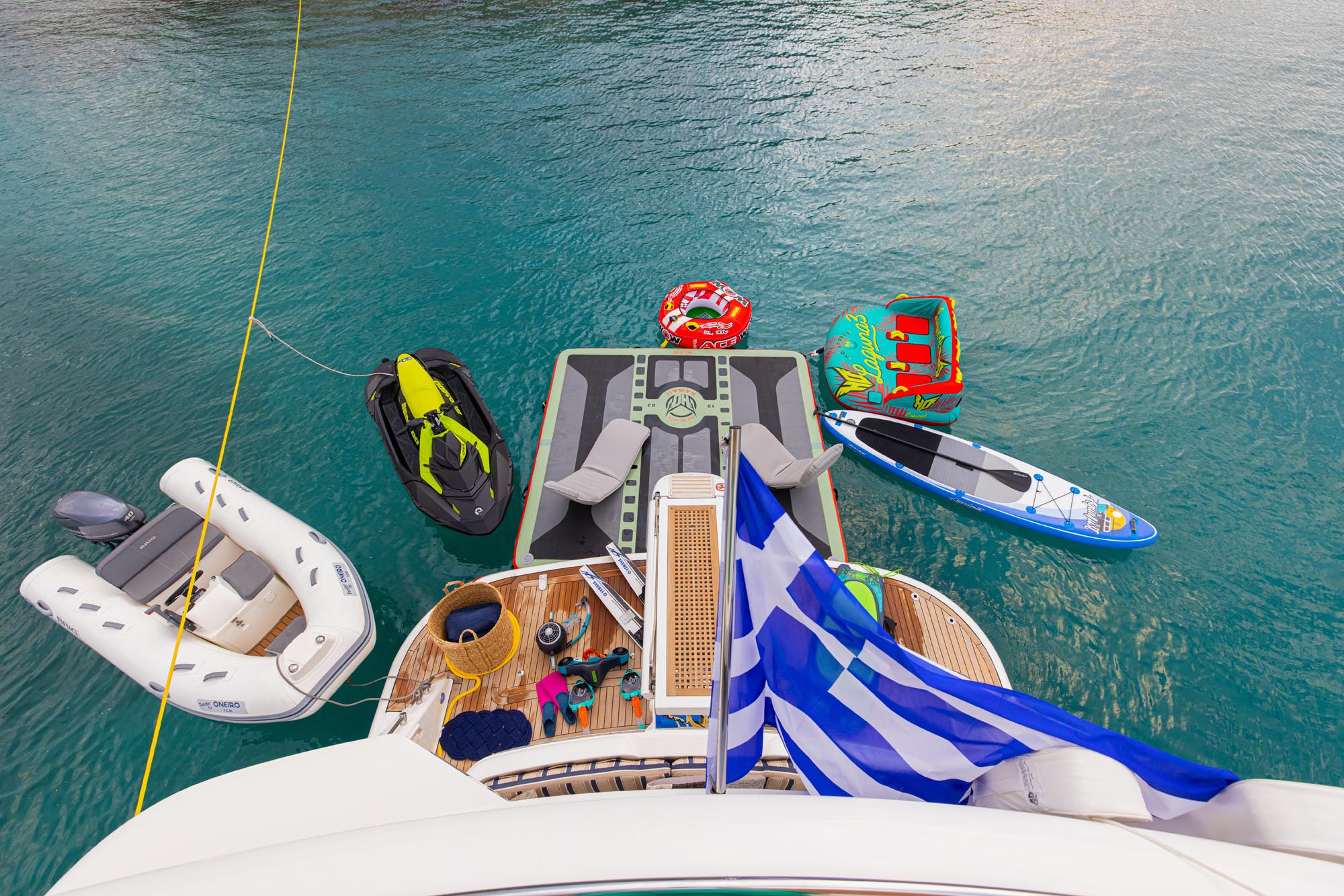 Additional Info – Equipment on Request (Extra Charge) Enhance your experience with a wide selection of premium water toys and equipment available upon request: · Jet ski Sea-Doo Spark (3-seater, license required) · Floating platform (3m x 3m) · Water ski · Sea scooter (Jobe) · Wakeboard · Kneeboard · Paddle board · Sea wrap · Donuts tube · 3-person sofa tube M/Y ONEIRO stands out for its elegant design, spacious layout, and premium onboard amenities, making it the perfect choice for guests who want to enjoy a luxurious and relaxing yacht booking experience in Greece.
